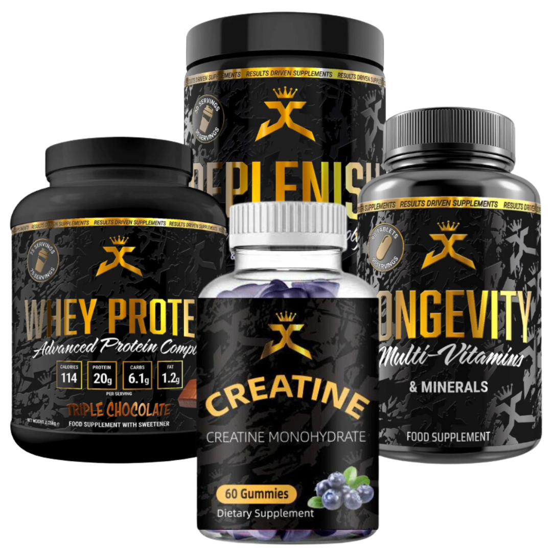 The Essentials Bundle provides 75 servings of Whey Protein, 60 creatine gummies, and a 3-month supply of our Longevity formula.